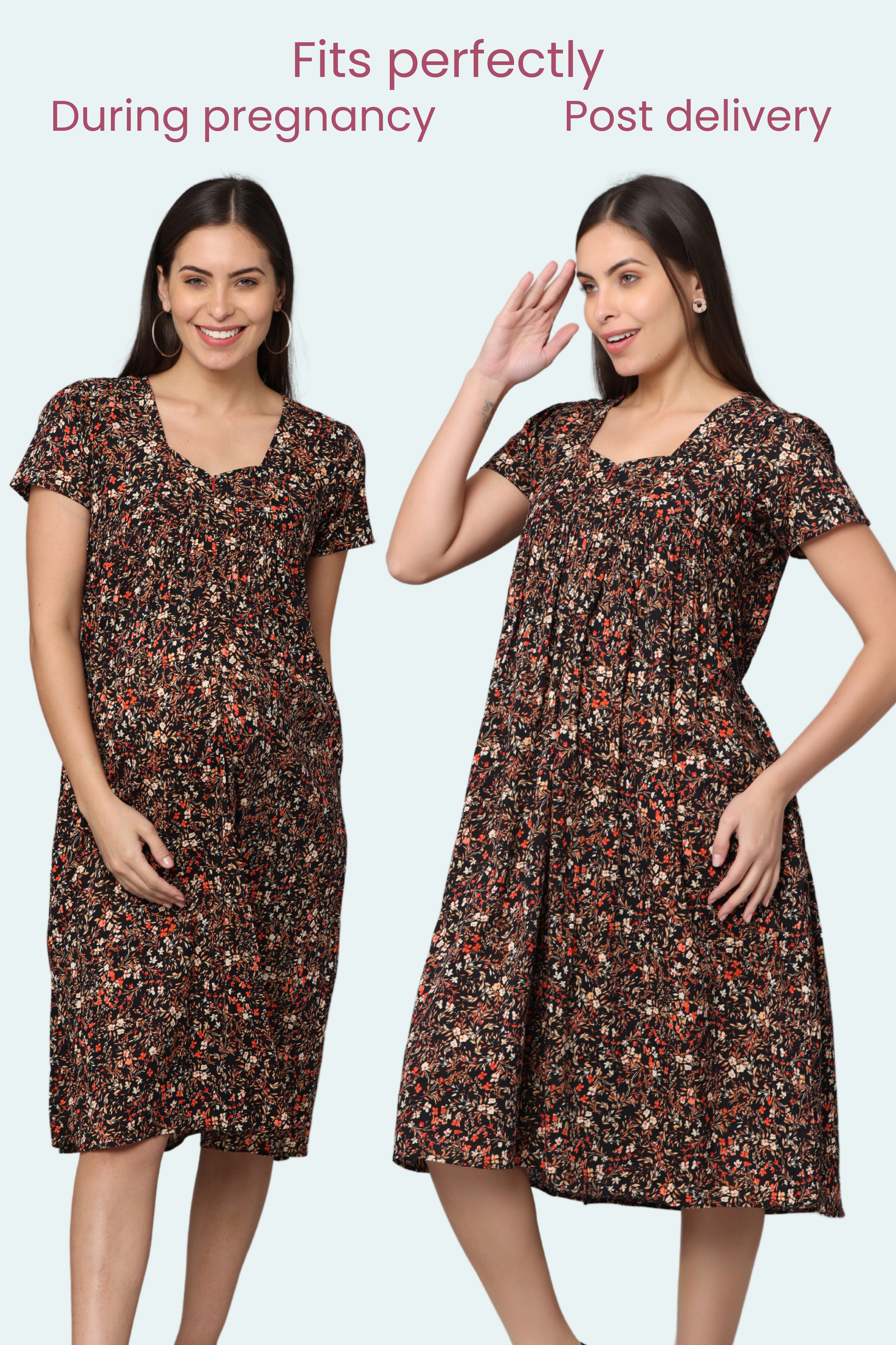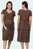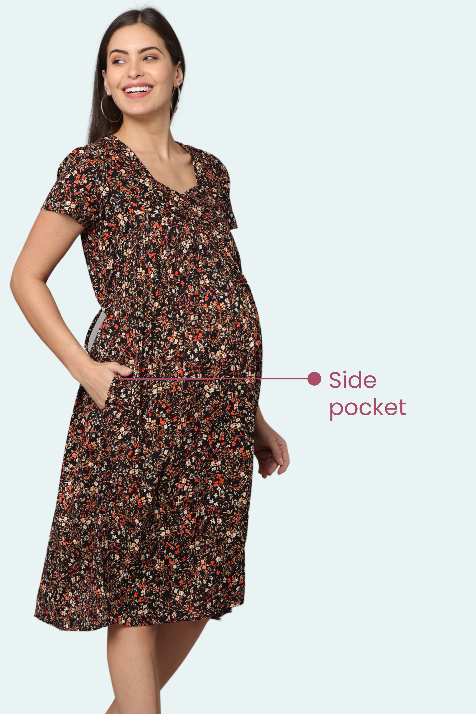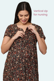 Autumn Floral Print Maternity Dress with Front Vertical Zipper | Perfect for Pregnancy & Breastfeeding