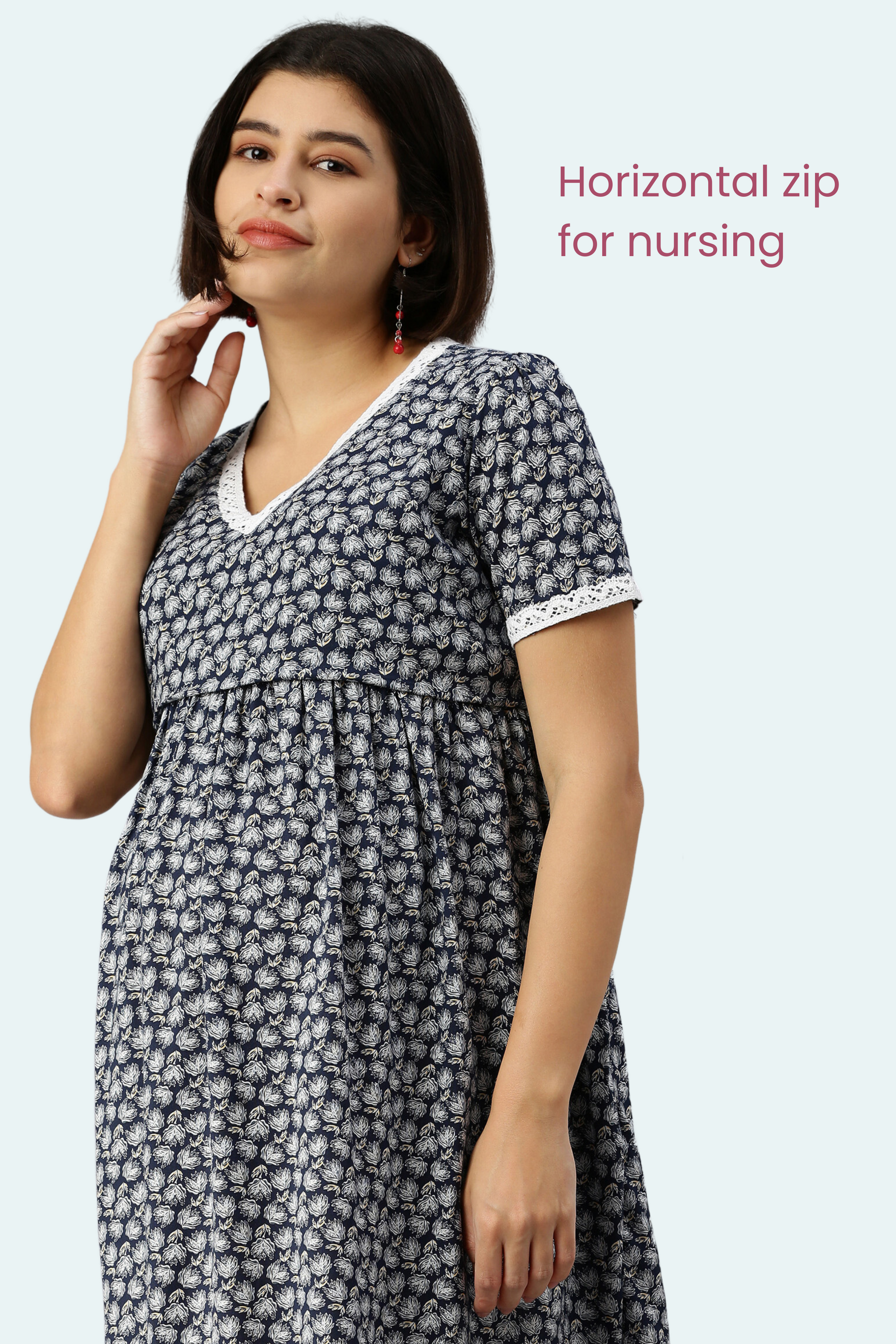 Navy Blue Printed Maternity Dress with Lace Trim | 1 Horizontal Zipper | Ideal for Pregnancy & Nursing