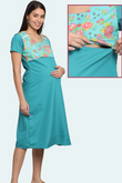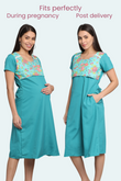 Teal Maternity Gown with Floral Yoke | Horizontal Zip Closures | Ideal for Pregnancy & Breastfeeding