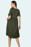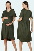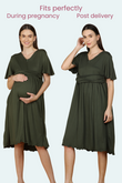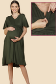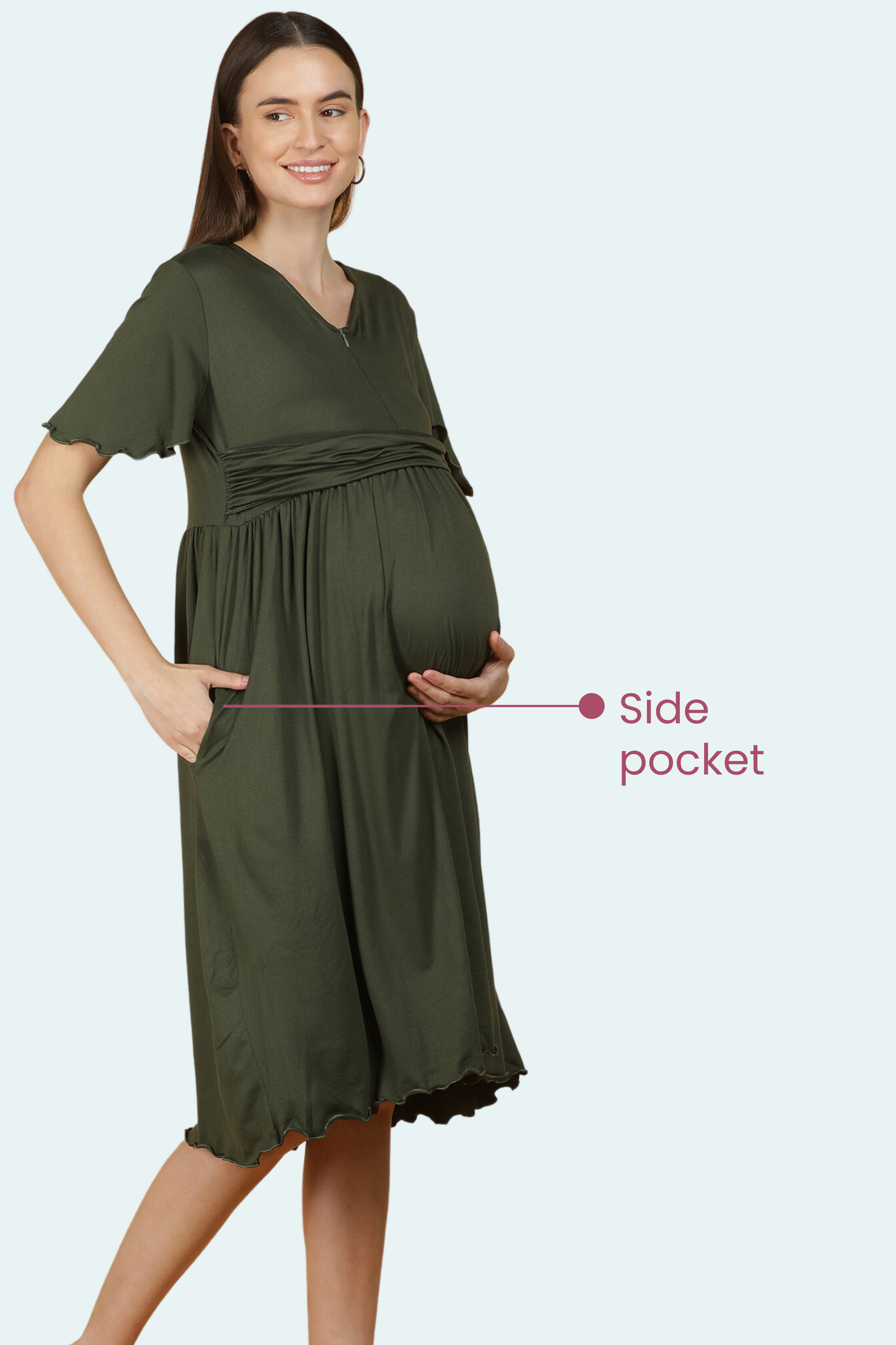 Elegant Olive Green Maternity Dress with Front Vertical Zipper | Ideal for Pregnancy & Breastfeeding