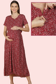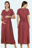 Cherry Red Floral Maternity Maxi Dress with Front Vertical Zipper | Perfect for Pregnancy & Breastfeeding