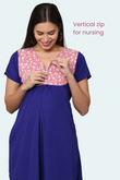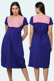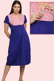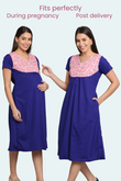 Navy Blue Maternity Gown with Pink Floral Yoke | Single Vertical Zip Closure | Ideal for Pregnancy & Breastfeeding