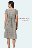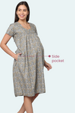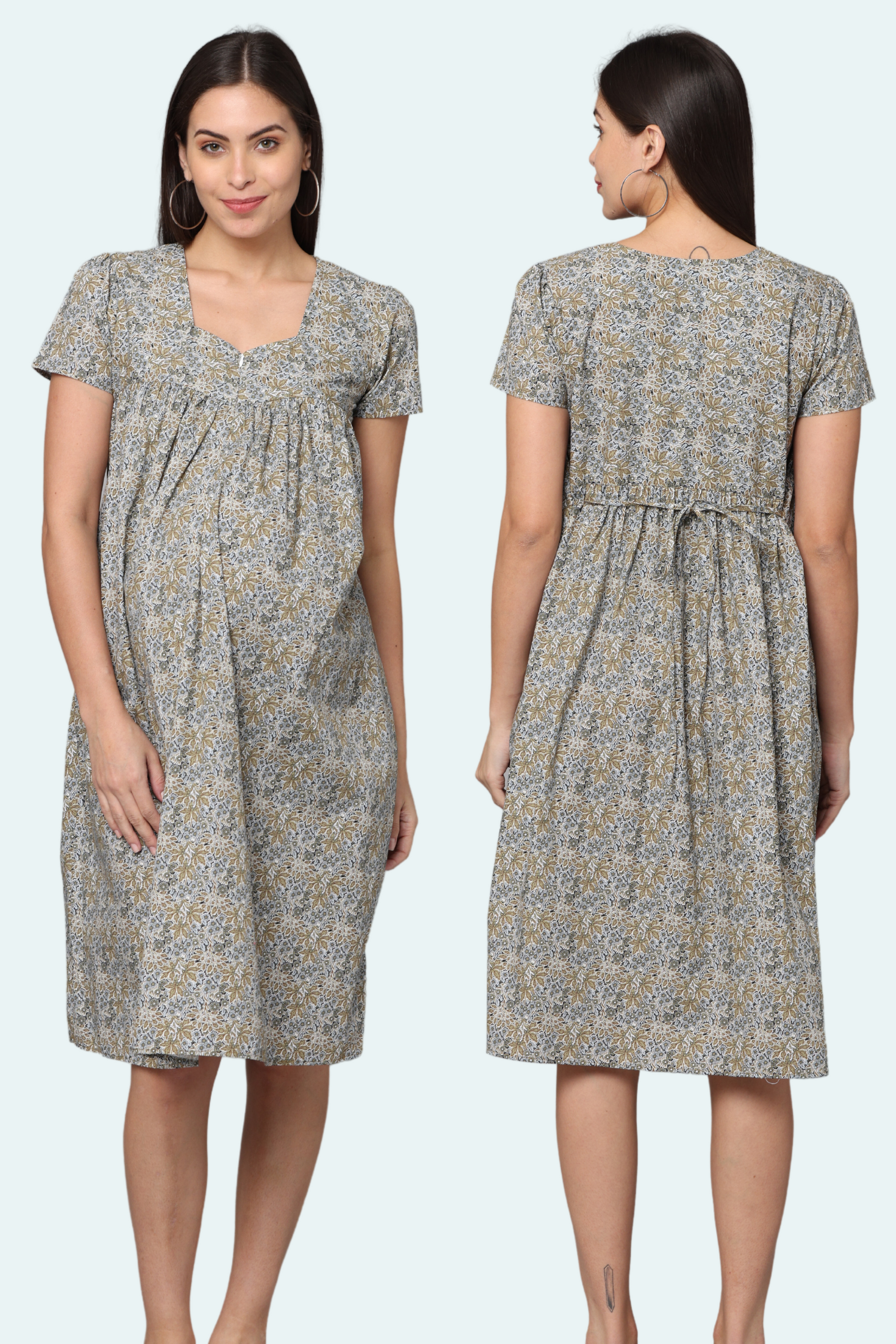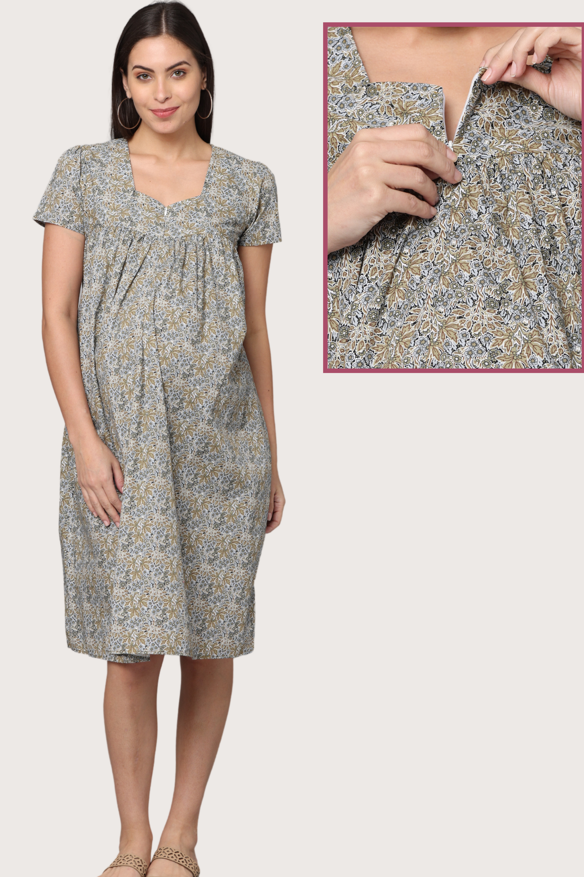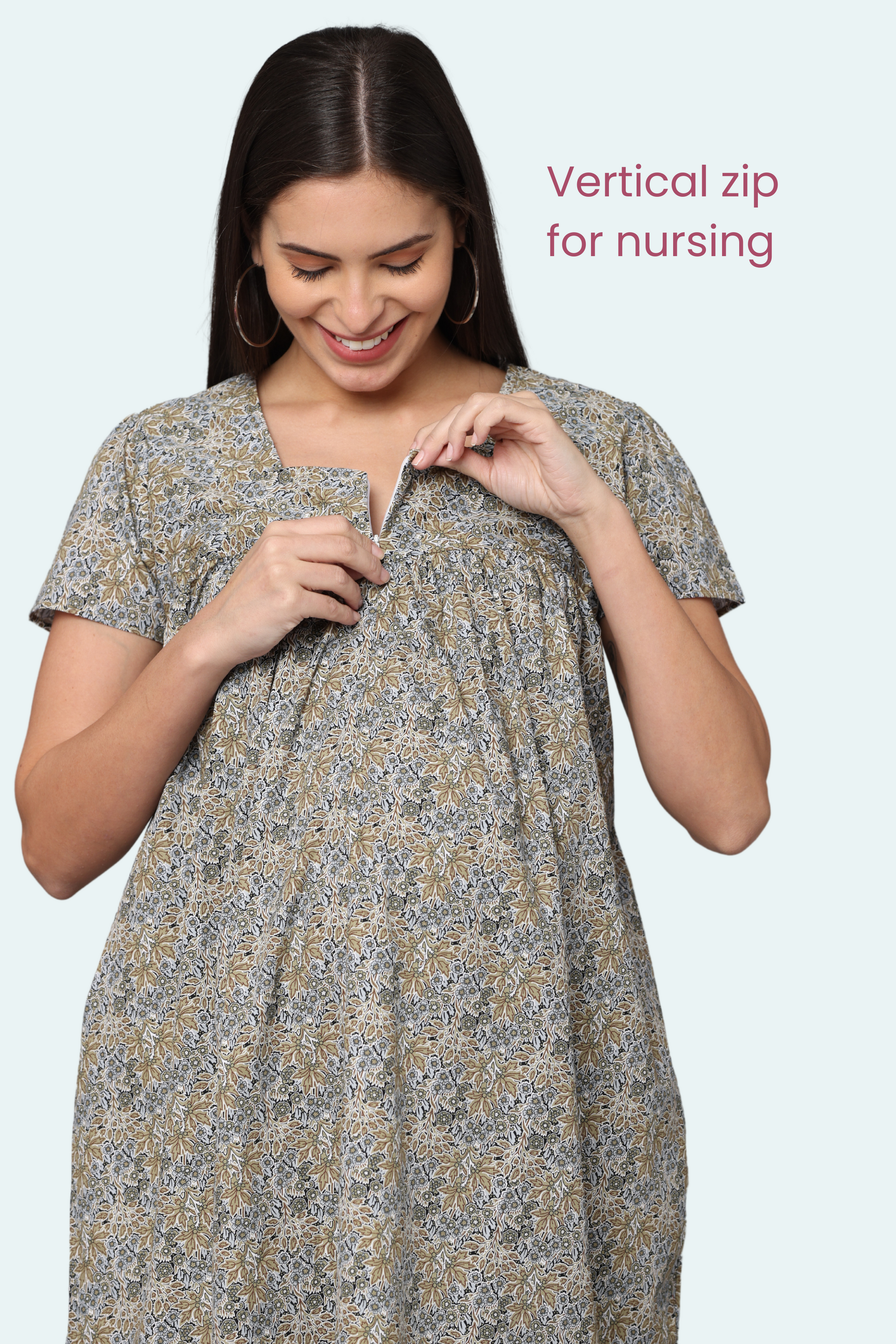 Neutral Floral Maternity Dress with Square Neck and Front Vertical Zipper | Perfect for Pregnancy & Breastfeeding