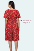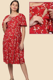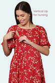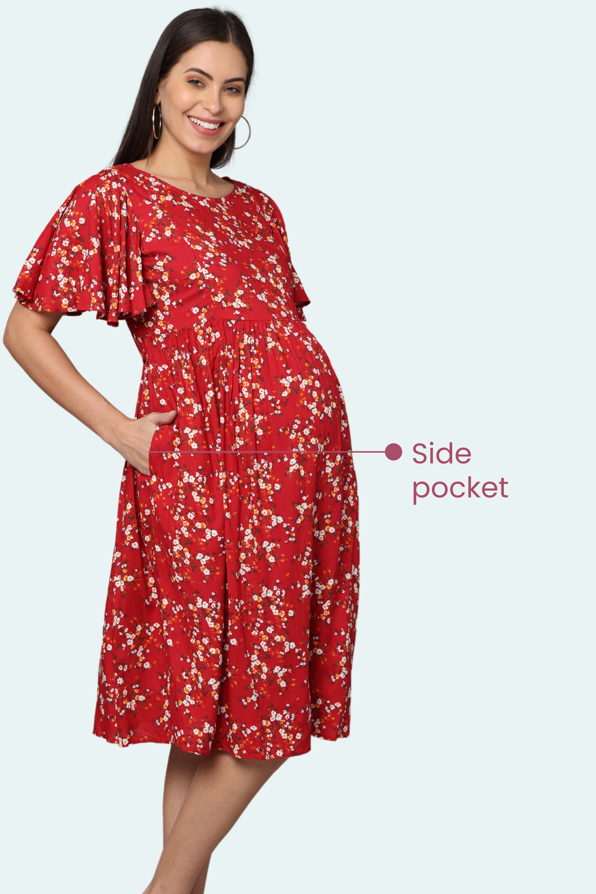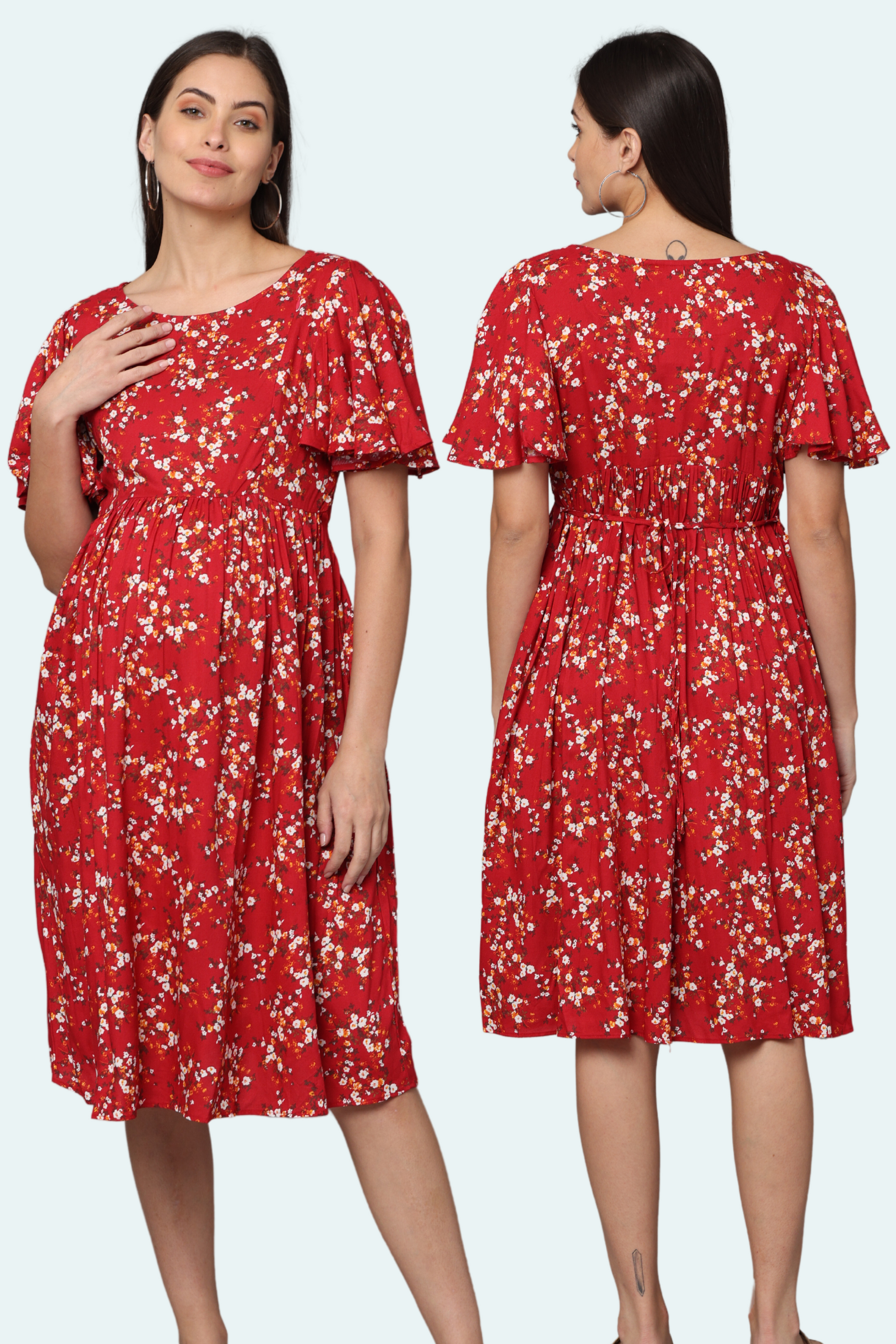 Red Floral Maternity Dress with Flutter Sleeves | 2 Vertical Zippers | Ideal for Pregnancy & Breastfeeding