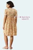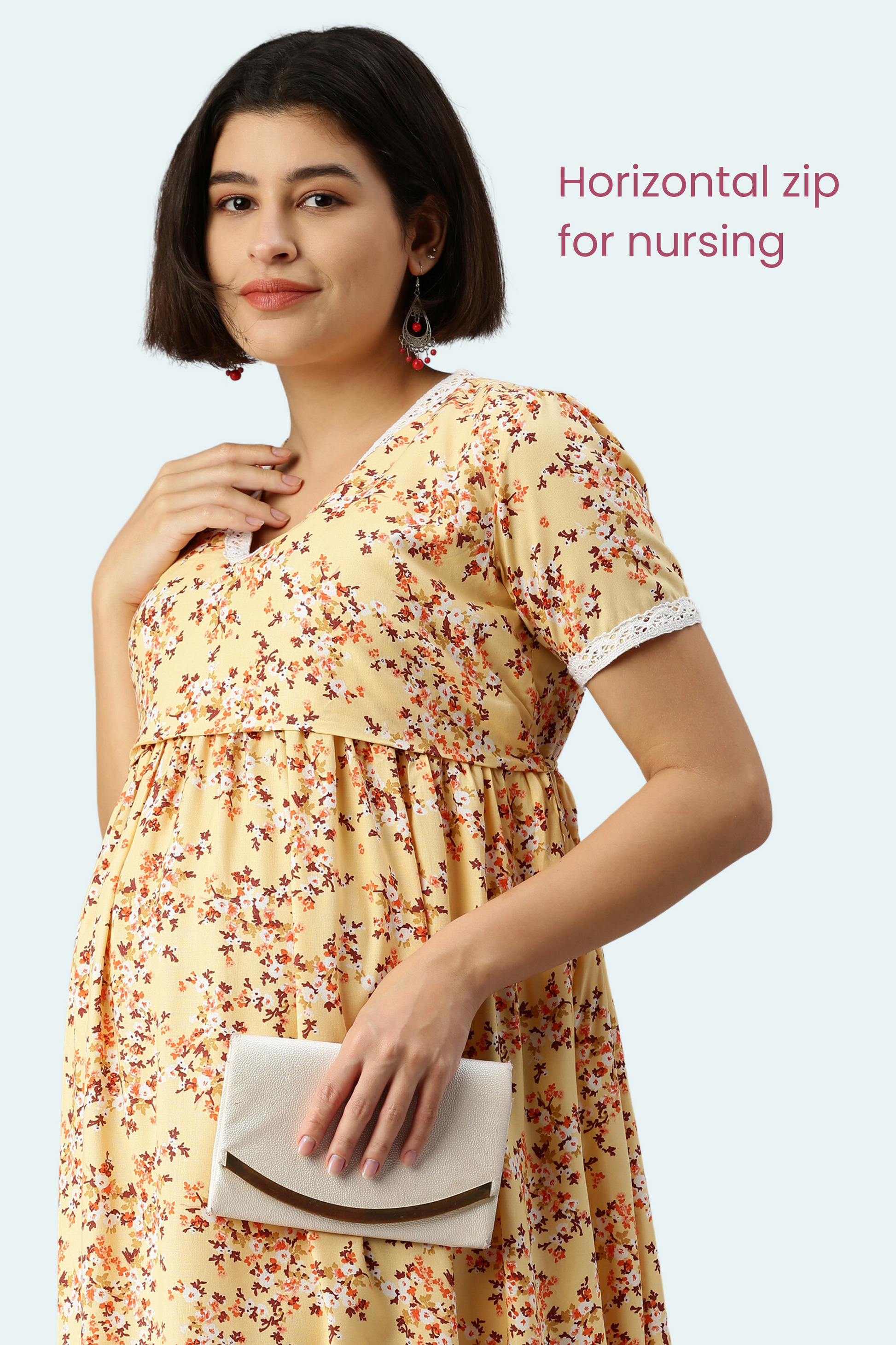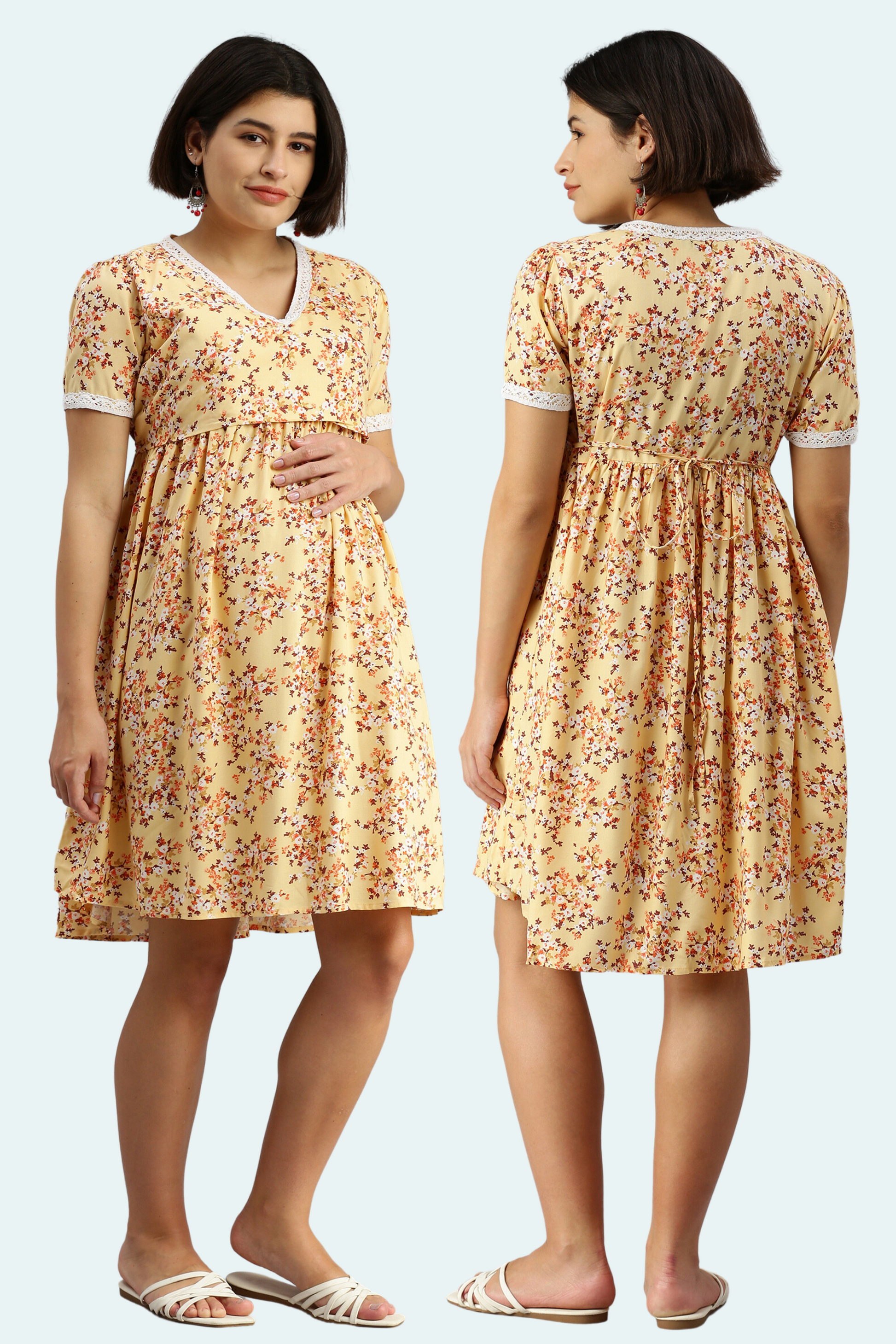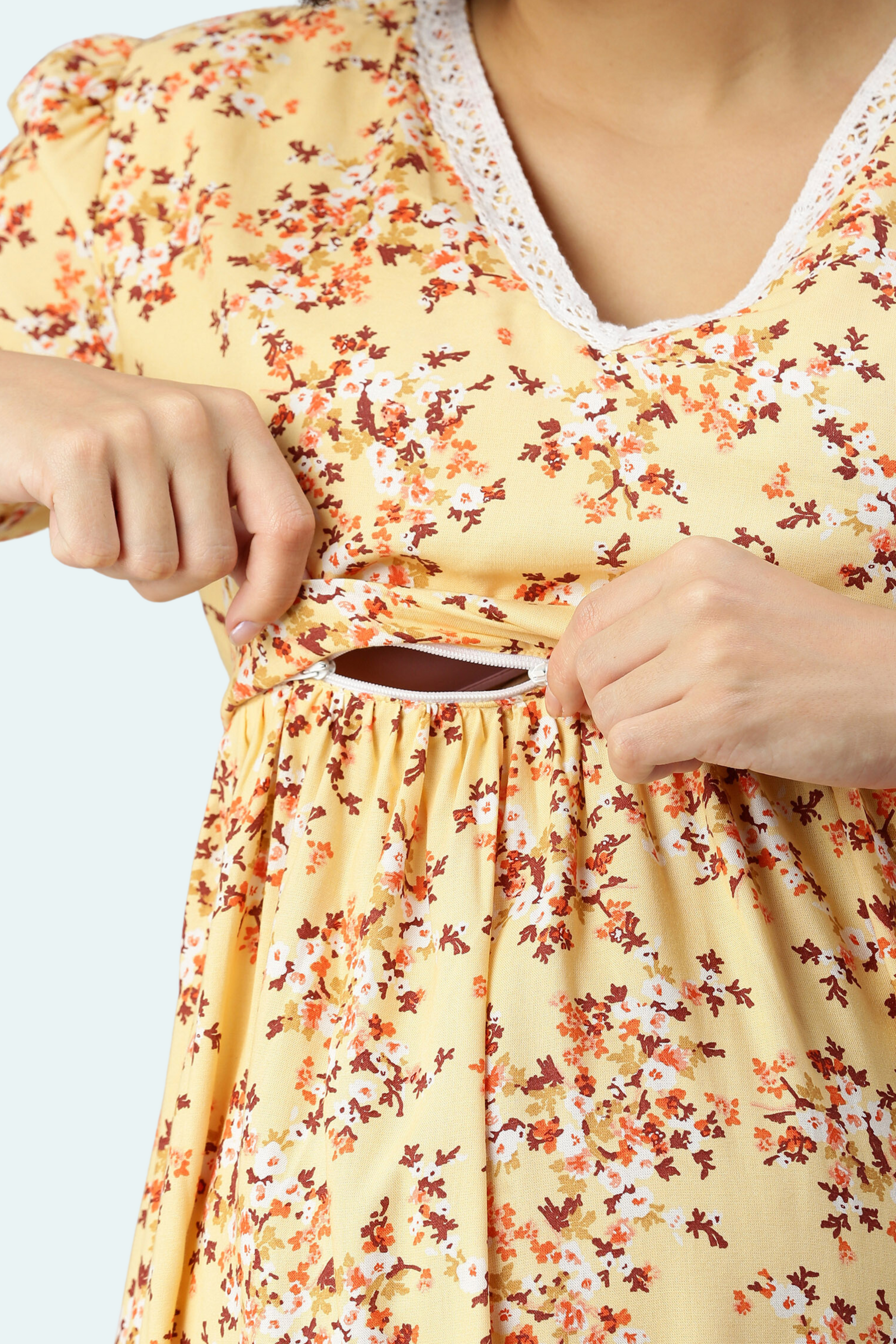 Yellow Floral Maternity Dress with Lace Trim | Horizontal Zipper | Ideal for Pregnancy & Breastfeeding